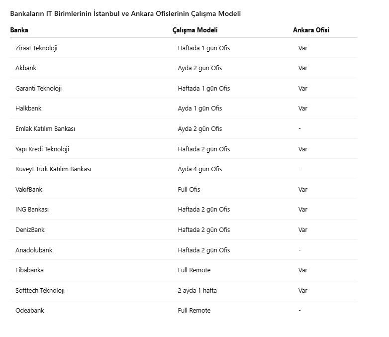 VakıfBank gibi “Full Ofis” modeli sürdüren istisnai örnekler dışında, genel eğilim açık: IT profesyonelleri artık ofise değil, işe odaklanıyor. “Çalışma yeri değil, sonuçlar önemli” anlayışı, bankacılık sektöründe de kalıcı hale geliyor.
