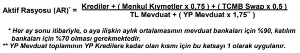 Bu çerçevede AR formülü de revize edildi. Formülün payı “krediler+(menkul kıymetler*0,75)+(TCMB Swap*0,5)” ve paydası ise “TL Mevduat+(YP Mevduat*1,75)” şeklinde hesaplanıyor.
