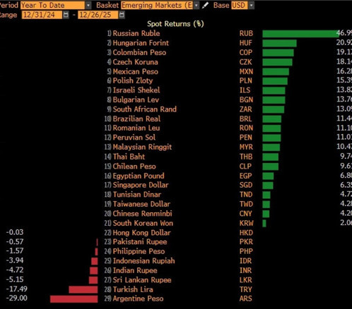 En iyi performans gösteren para birimleri sıralamasında ise Rus rublesi, dolar karşısında yüzde 47’lik kazançla ilk sırada yer aldı. Rusya’da yüksek reel faiz ve Ukrayna’da barış için ABD ile yapılan müzakereler, rubledeki değer kazancında etkili oldu.