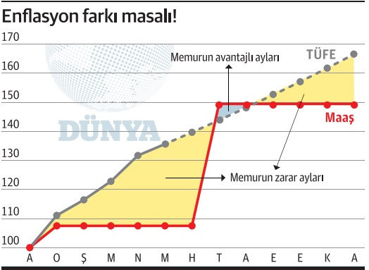 Bir memur aralık ayında diyelim net 10 bin lira maaş alıyordu. Ocak ayında yüzde 7.5 zam yapıldı ve net maaş 10.750 liraya çıktı, bu maaş altı ay boyunca da sabit kaldı. (Aslında burada vergi dilimini dikkate alırsak memur artık daha düşük maaş alıyor ama bunu göz ardı ediyorum.)