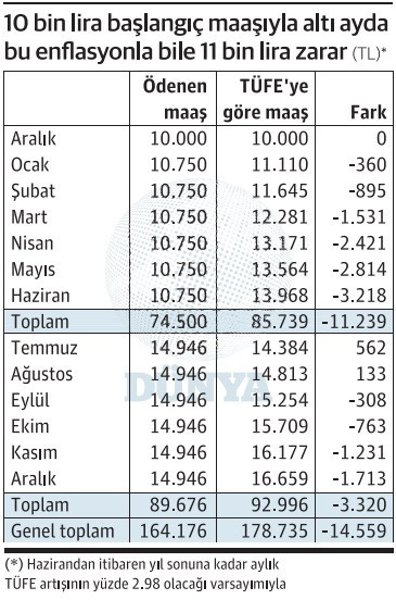 Altı ayda ödenen maaş 74.500 lira. Aralıktaki 10 bin lira her ay enflasyon kadar artsaydı altı ayda ödenecek maaş 85.739 lira olacaktı. Fark, 11.239 lira.
