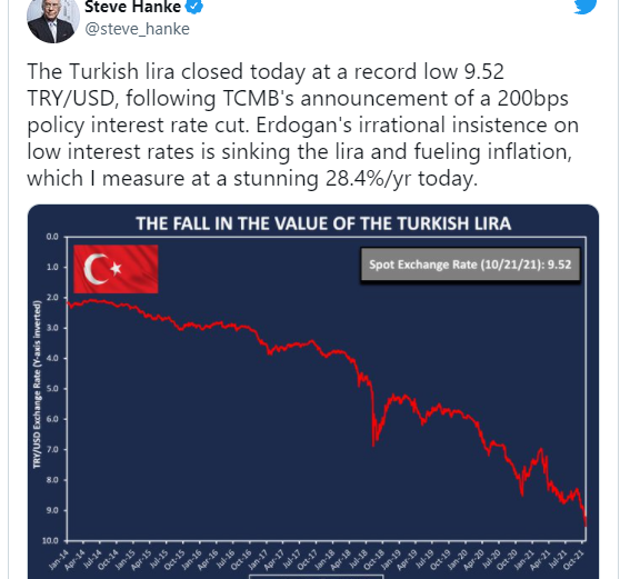 Johns Hopkins üniversitesinden ekonomist Prof. Steve Hanke, Twitter hesabından paylaşımda bulunarak “Erdoğan ekonomisi”ni eleştirdi.