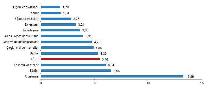 “Yıllık en düşük artış %15,08 ile haberleşme ana grubunda gerçekleşti. Bir önceki yılın aynı ayına göre artışın düşük olduğu diğer ana gruplar sırasıyla %26,73 ile eğitim, %26,95 ile giyim ve ayakkabı ve %34,95 ile sağlık oldu. Buna karşılık, bir önceki yılın aynı ayına göre artışın yüksek olduğu ana gruplar ise sırasıyla, %99,12 ile ulaştırma, %70,33 ile gıda ve alkolsüz içecekler, %69,26 ile ev eşyası oldu.