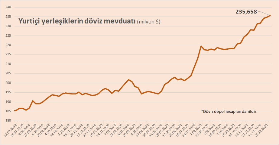 Bu tüm zamanların en yüksek döviz mevduatına işaret ederken 31 Aralık 2020 itibariyle bir önceki haftaya göre döviz mevduatındaki yükseliş ise 854 milyon dolar oldu. Dolar kurunun 7.34 liraya kadar gerilediği haftada bireylerin döviz mevduatı 1 milyar 864 milyon dolar artarak 150 milyar 195 milyon dolara çıkarken tüzel kişilerin döviz mevduatı 1 milyar 10 milyon dolar gerileyerek 85 milyar 463 milyon dolara indi. Bireylerin döviz mevduatındaki yükseliş ise kıymetli maden hesaplarını arttırmalarından kaynaklandı.