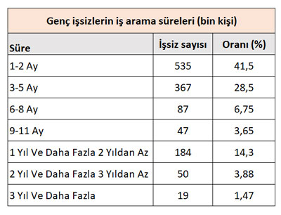 Türkiye’de 15-24 yaş grubunu oluşturan gençlerde TÜİK verilerine göre işsizlik oranı yüzde 25.3 ve işsiz sayısı da 1 milyon 290 bin kişi. Gençlerin çoğu ise işgücü dışında ki bu rakam da 6 milyon 545 bin kişi. Yani çalışma çağındaki 11 milyon 652 bin gencin sadece 5 milyon 107 bini işgücünde. İşsiz gençler ise 5 ay sonrasında iş bulamazlarsa en az 1 yıl işsiz kalıyor.