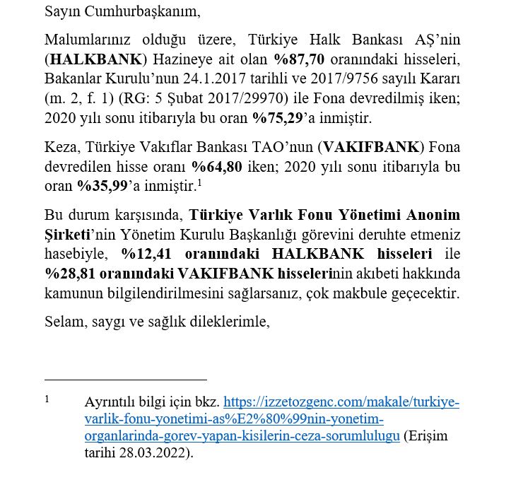Keza Vakıfbank’ın fona devredilen hisse oranı yüzde 64,80 iken 2020 yılı sonu itibariyle bu oran yüzde 35,99’a inmiştir. Bu durum karşısında Türkiye Varlık Fonu Yönetimi Anonim Şirketi’nin Yönetim Kurulu Başkanlığı görevini deruhte etmeniz hasebiyle yüzde 12,41 oranındaki Halkbank hisseleri yüzde 28,81 oranındaki Vakıfbank hisselerinin akıbeti hakkında kamunun bilgilendirilmesini sağlarsanız çok makbule geçecektir.” ifadelerini kullandı.