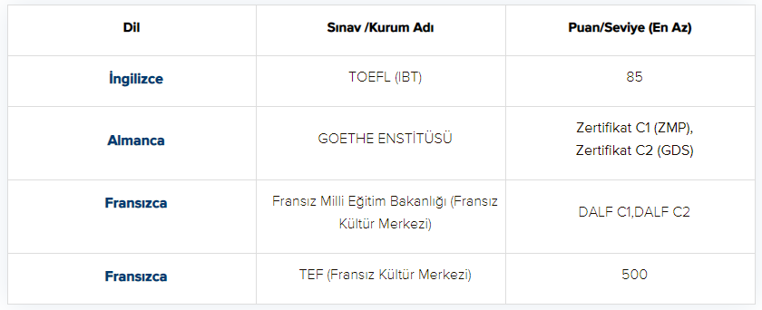 YABANCI DİL ŞARTI: Tabloda yer alan sertifikalardan birine sahip olmak gerekmektedir.