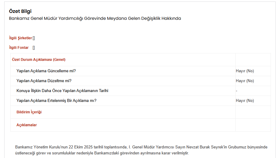İş Bankası, 2016 yılından bu yana bankada Genel Müdür Yardımcısı olarak görevini sürdüren Nevzat Burak Seyrek’in görevinden ayrıldığını duyurdu.