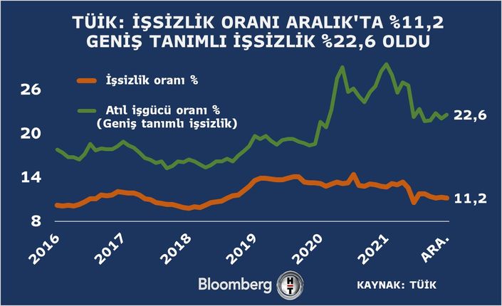 İşsizlik Aralık’ta yüzde 11,2 olarak kaydedildi. Kasım ayına ilişkin işsizlik oranı ise yüzde 11,2’den yüzde 11,3 seviyesine revize edildi.