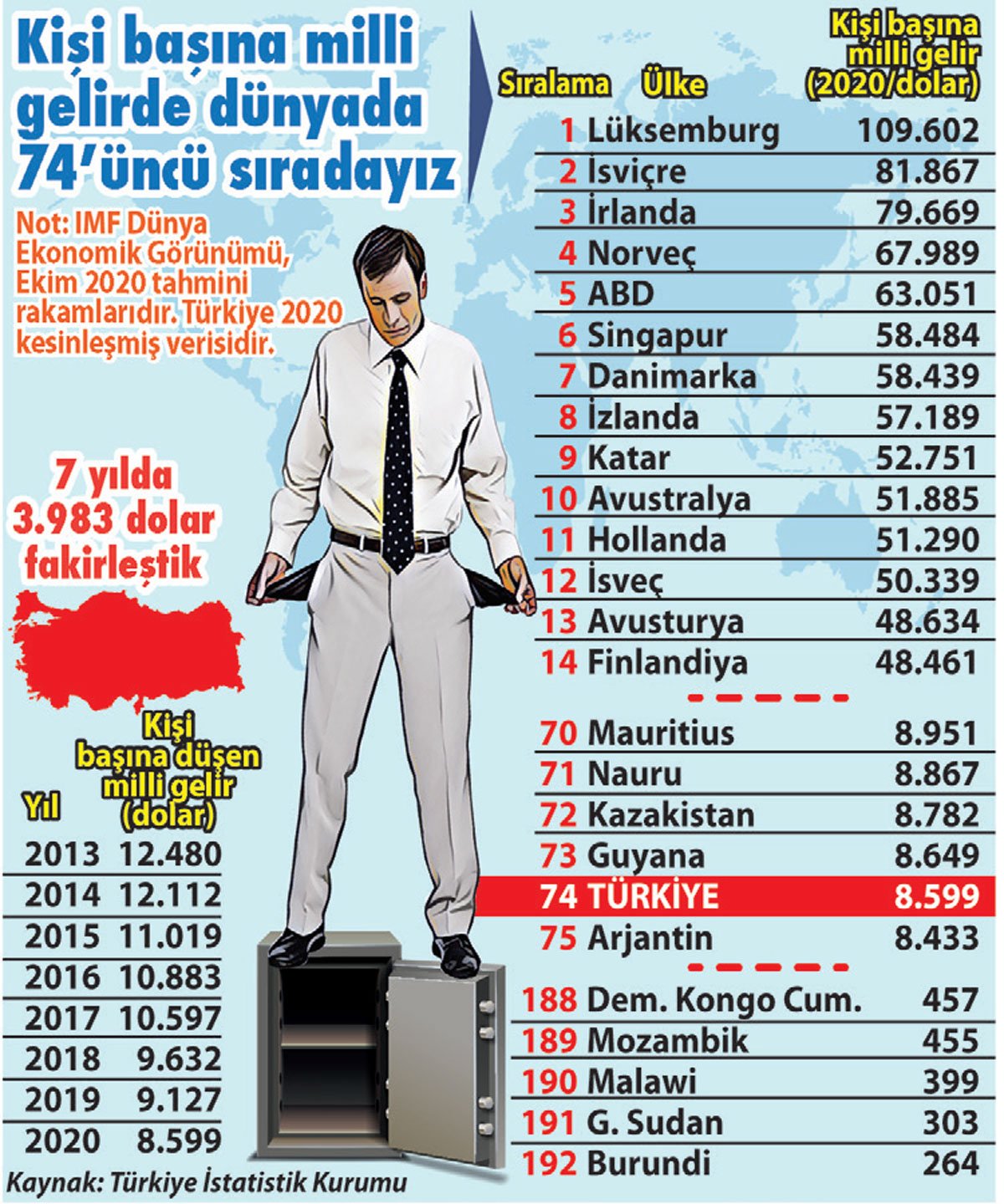 Türkiye, 2020 yılı için açıklanan 8.599 dolarlık kişi başına milli geliriyle, Bulgaristan, Romanya, Nauru, Kazakistan, Uruguay, Polonya gibi onlarca ülkenin gerisinde yer aldı. Uluslararası Para Fonu (IMF) verilerine göre Türkiye, 25 bin dolara çıkacağı vadedildiği halde 2019 yılına göre 528 dolar azalan kişi başına milli geliriyle 192 ülke arasında 74’üncü sıraya düştü.