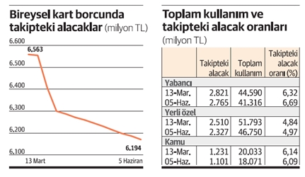 Bankacılık Düzenleme ve Denetleme Kurulu (BDDK), bankaların 17 Mart’ta borçları takip hesaplarına atmadan önce 90 gün değil 180 gün beklenmesi konusunda karar aldı. Bu karar ticari ve bireysel kredi borçlarında takipteki alacak oranlarının gerilemesini sağladı. Ayrıca kredilerde yeniden yapılandırma uygulamaları da takipteki alacak oranının düşmesinde etkili oldu. Ancak bireysel kredi kartı borçlarında aksi bir durum yaşanıyor. Bireysel kredi borcu toplamı 13 Mart haftasında 116 milyar 418 milyon lira idi. 5 Haziran haftasına gelindiğinde bu borç 106 milyar 138 milyon liraya geriledi. Takipteki alacak miktarı da azaldı ve 13 Mart’taki 6.5 milyar liradan 6.1 milyar liraya indi. Ama takipteki alacak oranı 0.2 puan yükseldi.