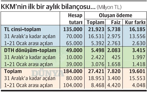 Kur korumalı mevduat uygulamasının yaklaşık ilk bir ayında 21 Ocak’a kadar 184 milyar liralık hesap açıldı. Bu tutarın 135 milyarı doğrudan TL cinsinden açılan hesaplar. DTH’den dönüşüm yoluyla açılan hesap toplamı ise 49 milyar.