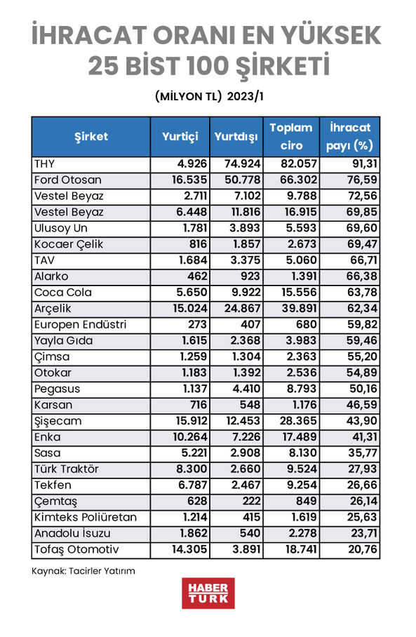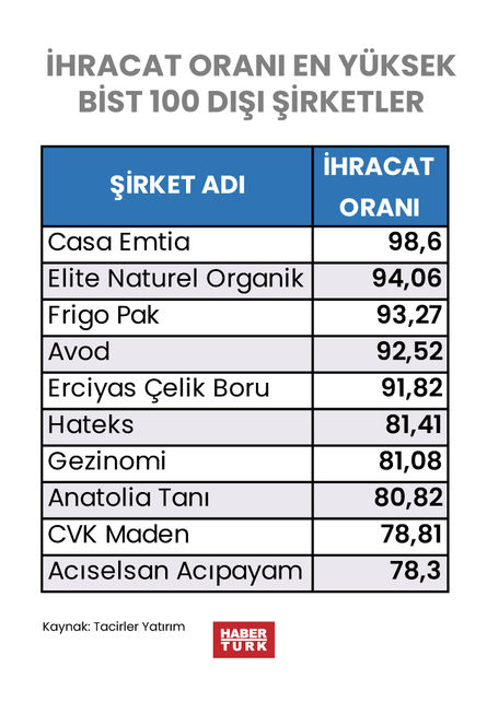 Borsanın en büyük 100 şirketi dışında da toplam gelirlerinin yüzde 90’ından fazlasını ihracattan kazanan Casa Emtia, Elite Natural ve Frigo Pak Gıda gibi şirketler bulunuyor.