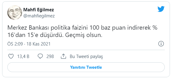 İktisatçı Mahfi Eğilmez, MB’in faiz kararı sonrası, “Merkez Bankası politika faizini 100 baz puan indirerek % 16’dan 15’e düşürdü. Geçmiş olsun” mesajını paylaştı.