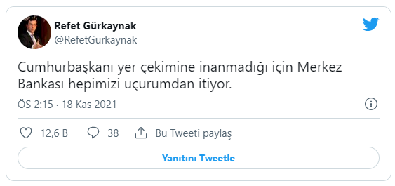 Refet Gürkaynak ise art arda attığı iki tweette, “Cumhurbaşkanı yer çekimine inanmadığı için Merkez Bankası hepimizi uçurumdan itiyor. Bu ülkenin milyonlarca insanının göz göre göre sefalete itildiğine şahit oluyoruz” ifadelerini kullandı.