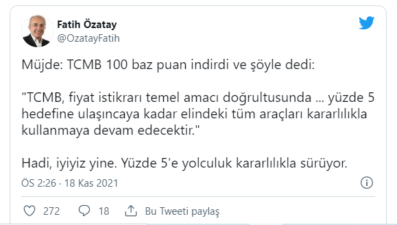 Prof. Dr. Fatih Özatay, “Müjde: TCMB 100 baz puan indirdi ve şöyle dedi: “TCMB, fiyat istikrarı temel amacı doğrultusunda … yüzde 5 hedefine ulaşıncaya kadar elindeki tüm araçları kararlılıkla kullanmaya devam edecektir.” Hadi, iyiyiz yine. Yüzde 5’e yolculuk kararlılıkla sürüyor” diyerek faiz indiriminin devam edeceği mesajına gönderme yaptı.