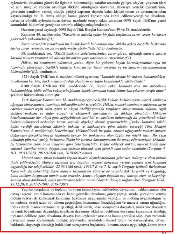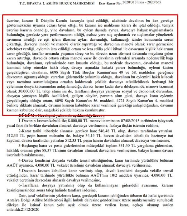 Isparta İdare Mahkemesi ilk olarak, usulden idareye değil kişiye husumet yöneltildiği iddiasıyla davayı reddetmiştir. Ancak Bölge İdare mahkemesi, kişisel kusura dayanması halinde amirden tazminat istenebileceğini belirtmiştir. İstinaf kararı üzerine dosyayı bir kez daha ele alan idare mahkemesi bu kez, davalının yaptıklarıyla tam kusurlu olduğuna karar vermiş ve 8 bin TL manevi tazminata hükmetmiştir. Bölge İdare Mahkemesi de bu kararı onamıştır.