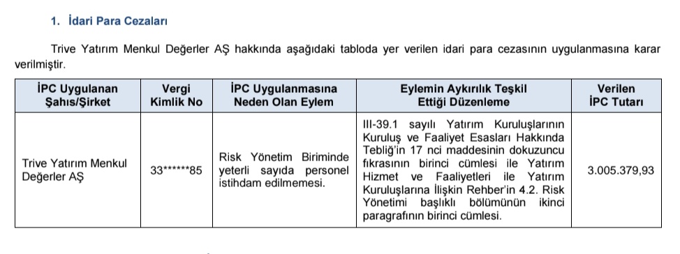 SPK Bültenine göre Trive Yatırım’a risk yönetim biriminde yeterli personel bulundurmadığı gerekçesiyle 3 milyon TL idari para cezası kesildi.