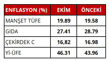 Tüketici fiyatları, ekim ayında aylık bazda yüzde 2,39 artarken, yıllık enflasyon yüzde 19,58’den yüzde 19,89’a yüksedi. Enflasyonun gıda fiyatları, sigara ve yakıt fiyatlarına gelen zam ve TL’deki devam eden değer kaybı etkisi ile ekimde aylık bazda yüzde 2,6, yıllık ise yüzde 20,2 artması bekleniyordu.