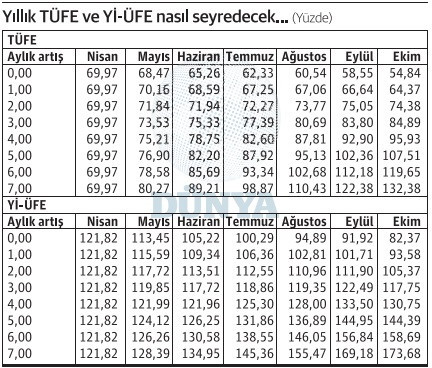 TÜFE’de üç hane, fiyatlar mayıstan itibaren her ay ortalama yüzde 5 artarsa eylül ayında, aylık ortalama artış yüzde 6 olursa bu sefer ağustos ayında görülecek.