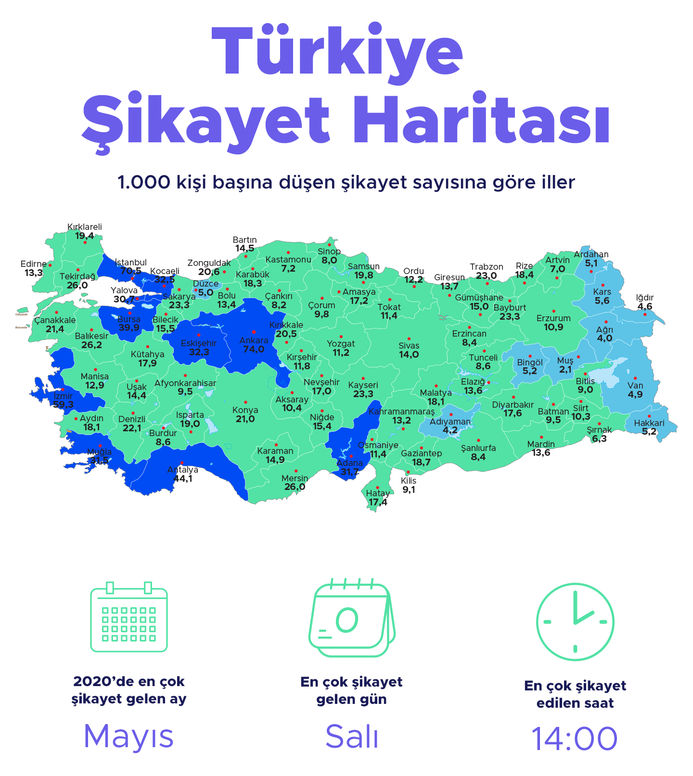 Şikayetvar verilerine göre Ankara 2020’de şikayetin en yoğun olduğu il oldu. Başkent Ankara’da her bin kişiye 74 şikayet düşerken, İstanbul’da bu oran 70 oldu… İzmir ise her bin kişiye düşen 60 şikayet sayısıyla üçüncü sırada yer aldı. Üç metropolü sırasıyla Antalya, Bursa, Kocaeli, Eskişehir ve Adana takip etti.