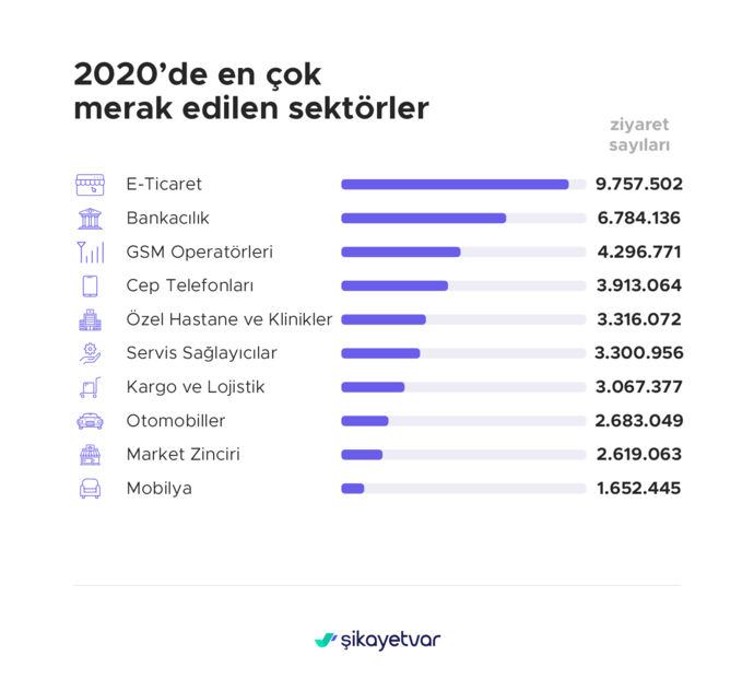 Şikayetvar’da en çok ziyaret edilen sektör 9 milyon 757 bin 502 ziyaretçi sayısıyla e-ticaret sektörü oldu. Bankacılık (6 milyon 784 bin 136) en çok ziyaret edilen ikinci, GSM Operatörleri ise (4 milyon 296 bin 771) üçüncü sektör olarak öne çıktı. Cep telefonu, özel hastane ve klinikler de en çok ziyaret edilen diğer sektörler olarak sıralandı.