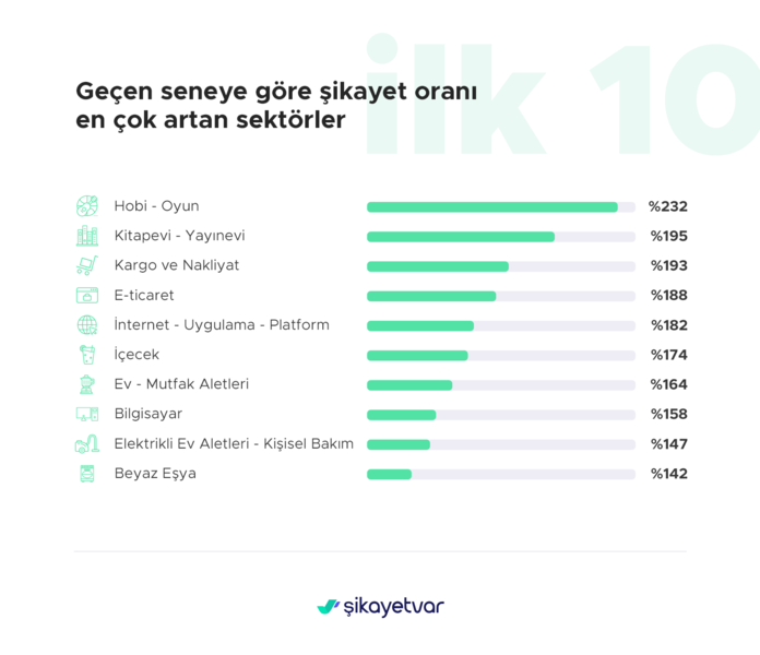 Kitapevleri ve yayınevi kategorisinde bu oran yüzde 195 olurken, kargo ve nakliyat kategorisinin şikayet artış oranı yüzde 193’e ulaştı. Geçtiğimiz yıla göre şikayet artış oranı en yüksek sektörlerden bir diğeri de e-ticaret (yüzde 188) kategorisi oldu. Onu uygulama platformları (yüzde 182),içecek (yüzde 174) ve ev-mutfak aletleri izledi.