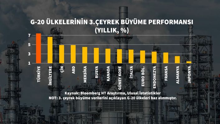 Üçüncü çeyrek performansı Türkiye’yi G-20 içinde ilk sıraya taşıdı. G-20 içinde Türkiye’yi yüzde 6,6 ile İngiltere, yüzde 4,9 ile Çin takip etti.