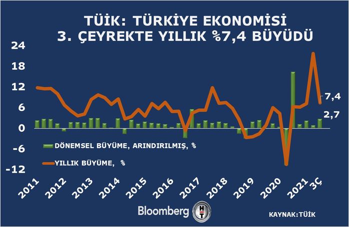 Türkiye ekonomisi yılın üçüncü çeyreğinde yüzde 7,4 büyüdü.