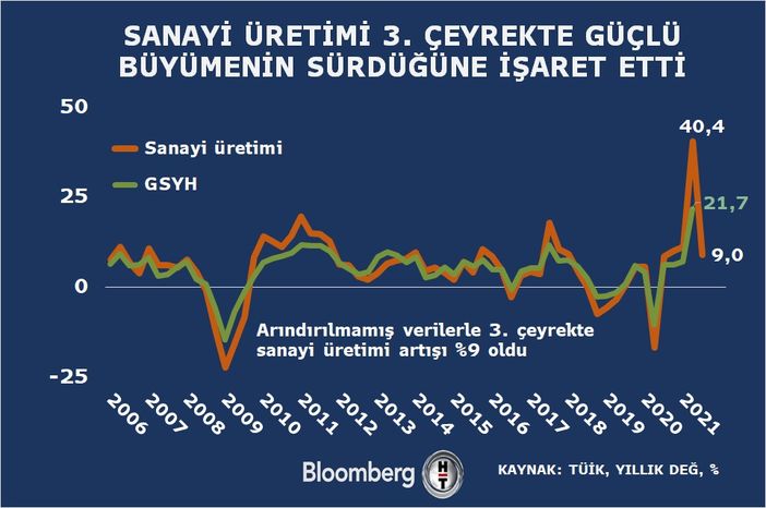 TÜİK’in açıkladığı verilere göre takvim etkisinden arındırılmış sanayi üretimi 2021 yılı üçüncü çeyreğinde bir önceki yılın aynı çeyreğine göre yüzde 10,8 artmıştı. Bir önceki çeyreğe göre mevsim ve takvim etkilerinden arındırılmış sanayi üretimi ise yüzde 1,6 artmıştı.