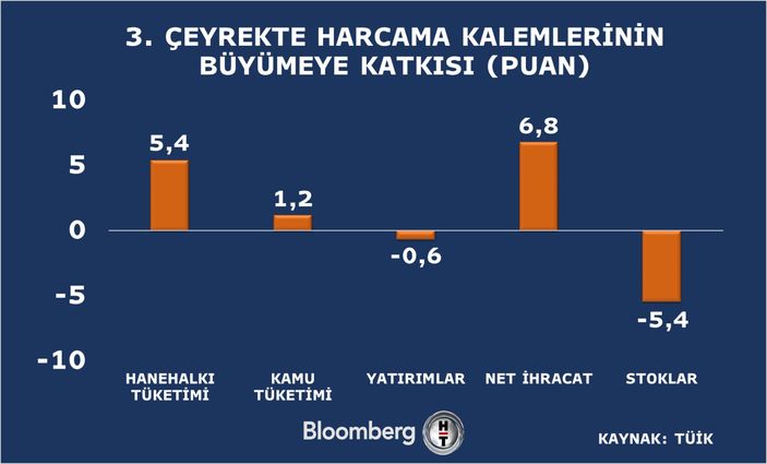 İhracatı 5,4 puanlık katkıyla iç tüketim, 1,2 puanla devlet harcamaları izledi. Yatırımlar büyümeden 0,6 puan götürürken stoklar ise 5,4 puanlık negatif etki etti.