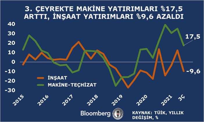 TÜİK verilerine göre üçüncü çeyrekte makine-teçhizat yatırımları büyümesine devam etti. Üçüncü çeyrekte makine-teçhizat yatırımlarındaki büyüme yüzde 17,5 oldu. İnşaat yatırımları ise yüzde 9,6 daraldı.