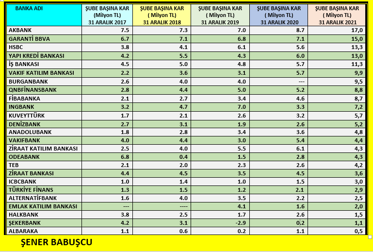 31 Aralık 2021 bilançolarına göre şube başına karlılıkta zirvede geçen yıl da birinci olan Akbank yer almaktadır. Garanti BBVA ikinci ve HSBC ise üçüncü sırada yer alıyor.