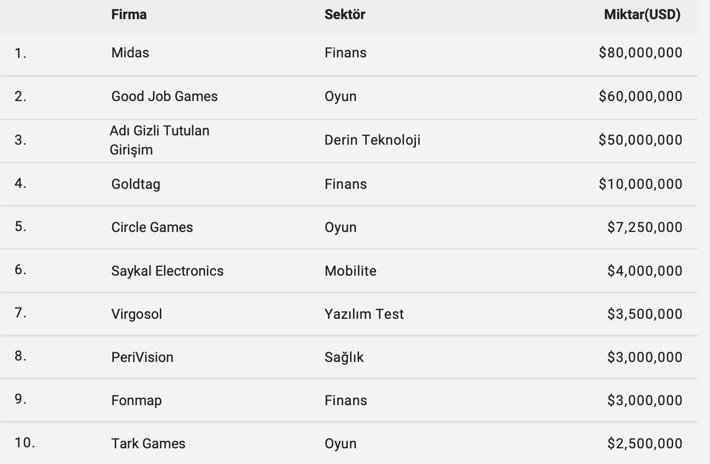 Yılın üçüncü çeyreği, yüksek tutarlı yatırımların belirleyici olduğu bir dönem olarak öne çıktı. Çeyreğin en büyük yatırımı, finans sektöründe faaliyet gösteren Midas’ın aldığı 80 milyon dolarlık yatırım oldu. Onu Good Job Games(60 milyon dolar) ve adı açıklanmayan bir derin teknoloji girişimi (50 milyon dolar) izledi. Bu üç yatırım, toplam yatırım tutarının yaklaşık yüzde 40’ını oluşturdu.