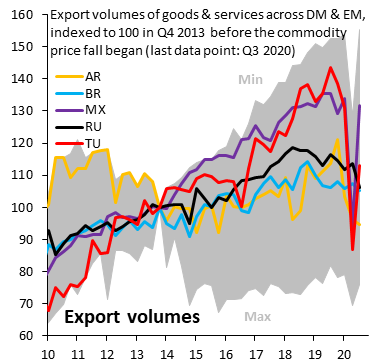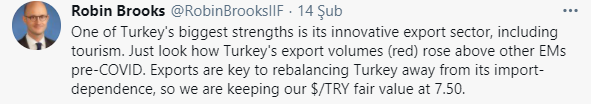 Uluslararası Finans Enstitüsü (IIF) Başkanı Robin Brooks, Twitter üzerinden yaptığı paylaşımında, “Türkiye’nin en güçlü taraflarından biri yenilikçi ihracat sektörü – turizm de dahil. Bakın grafikte de ihracat hacimleri nasıl diğer EM’lere göre Kovid-19 öncesi düzeylere çıktı. İhracat Türkiye’nin ithalat bağımlılığını azaltması için kritik öneme sahip. Bu nedenle dolar/TL’nin adil değerini 7.50 olarak görüyoruz” ifadelerini kullandı.