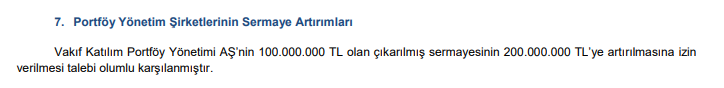 Katılım finans ilkeleri doğrultusunda bireysel ve kurumsal müşterilere özel projeler geliştiren, girişim sermayelerini destekleyerek yeni fon modelleri oluşturmayı hedefleyen Vakıf Portföy Yönetimi’nin 100.000.000 TL olan çıkarılmış sermayesinin 200.000.000 TL’ye artırılmasına SPK izin verdi.